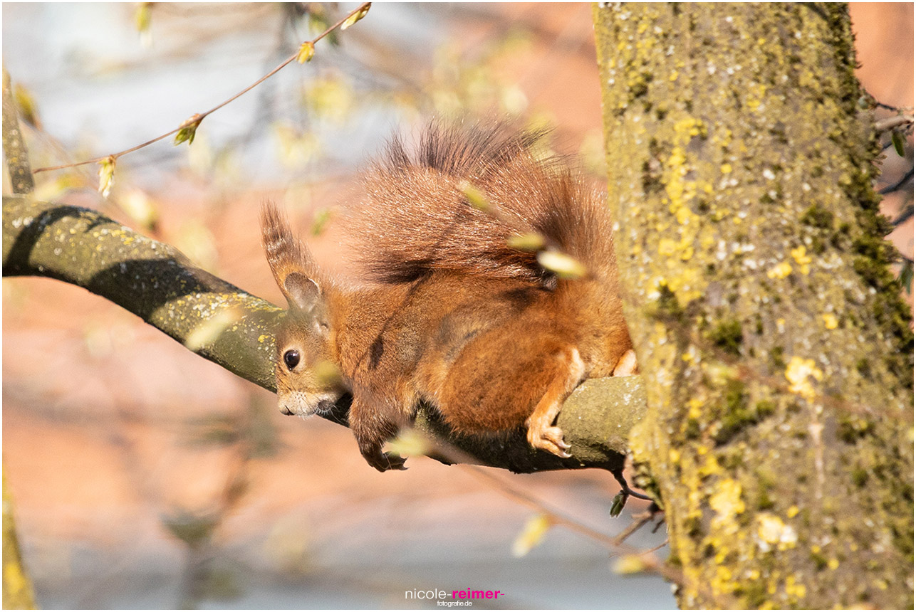 Mrs Puschel, das rote Eichhörnchen liegt auf einem Ast und genießt die Sonne - Nicole Reimer Fotografie